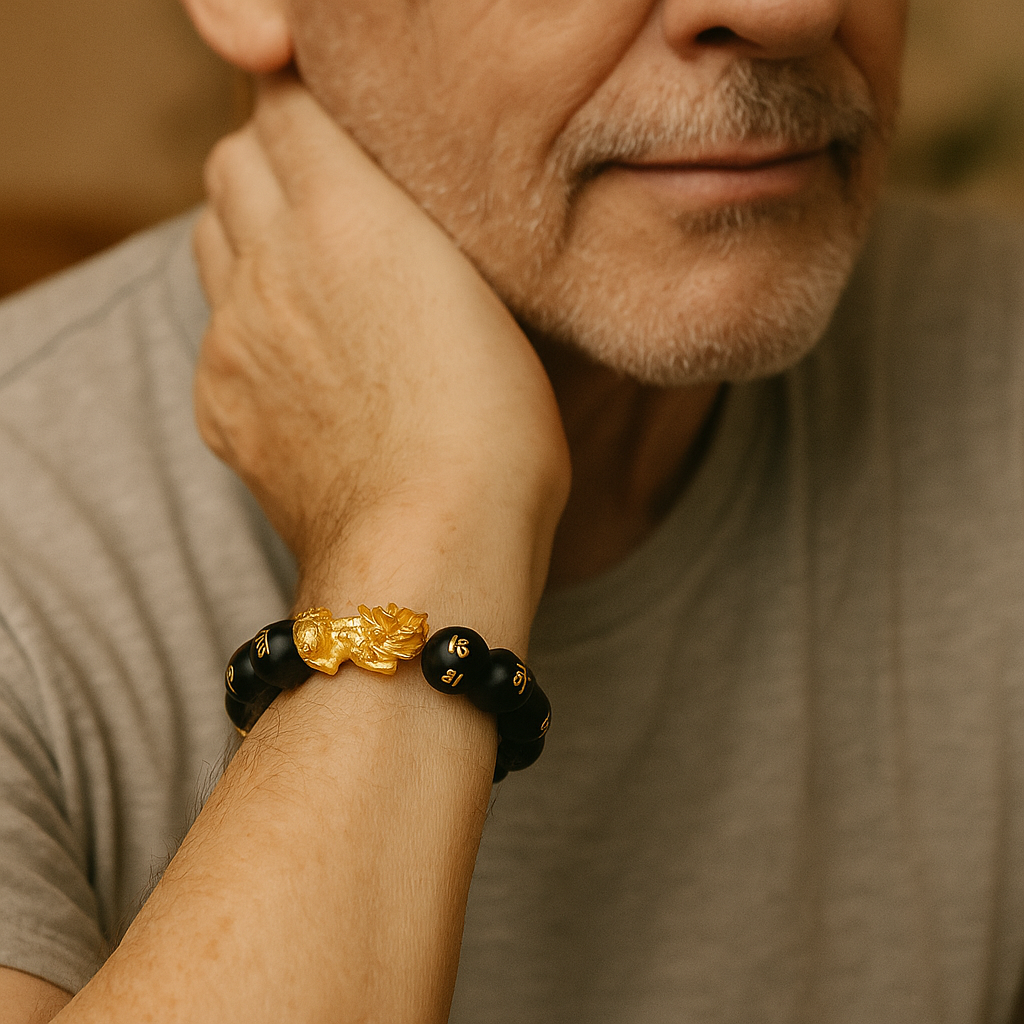 Detta kraftfulla armband kombinerar Svart Obsidian och den mytiska varelsen Pixiu – en feng shui-symbol för skydd, rikedom och framgång.