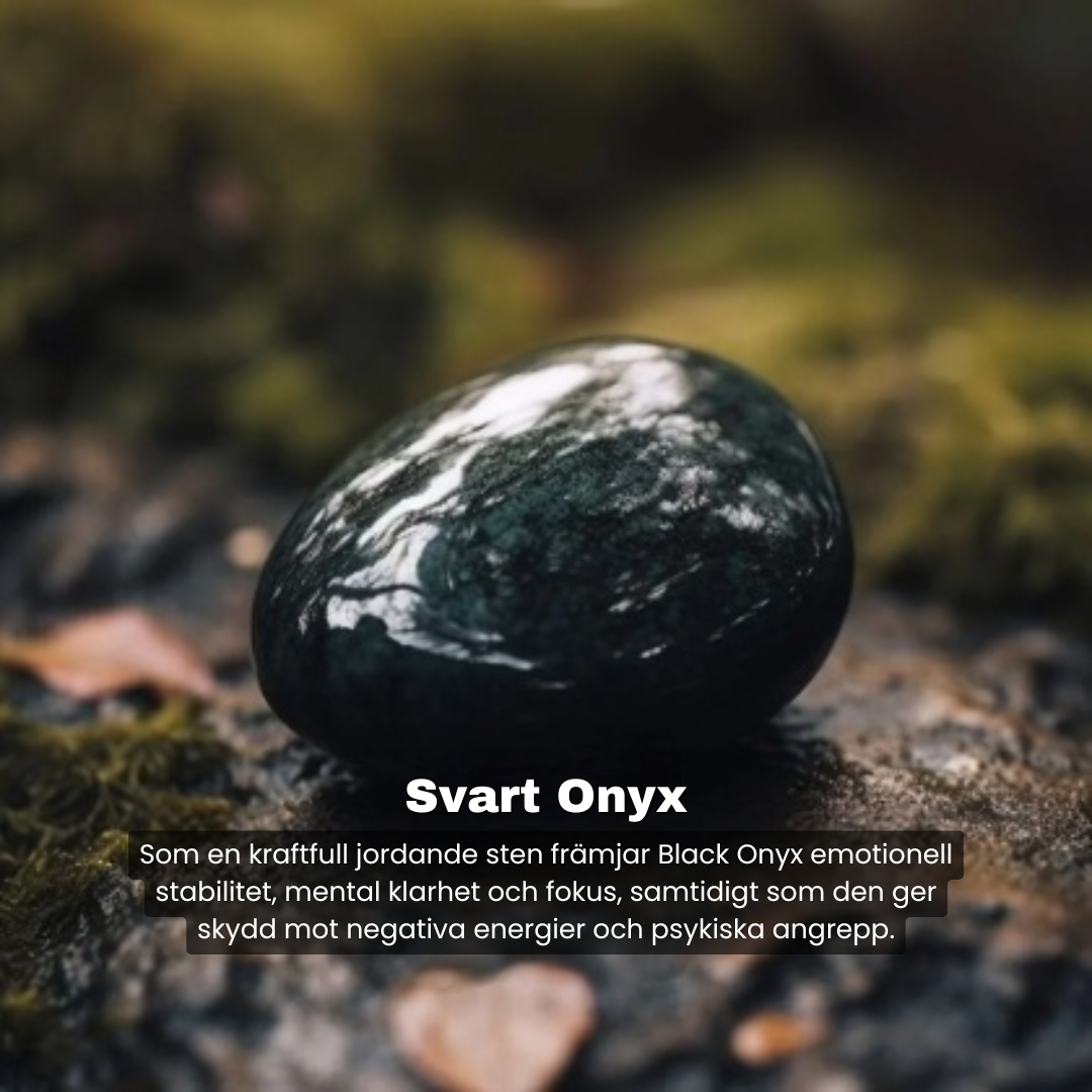 ⚫ Svart Onyx: En jordande sten som främjar inre lugn och stabilitet.